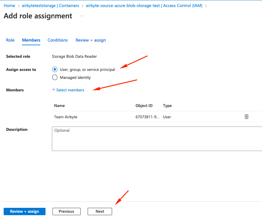 4. Select User, Group, or service principal, click on members and select member(s) so they appear in table and click Next Add Members